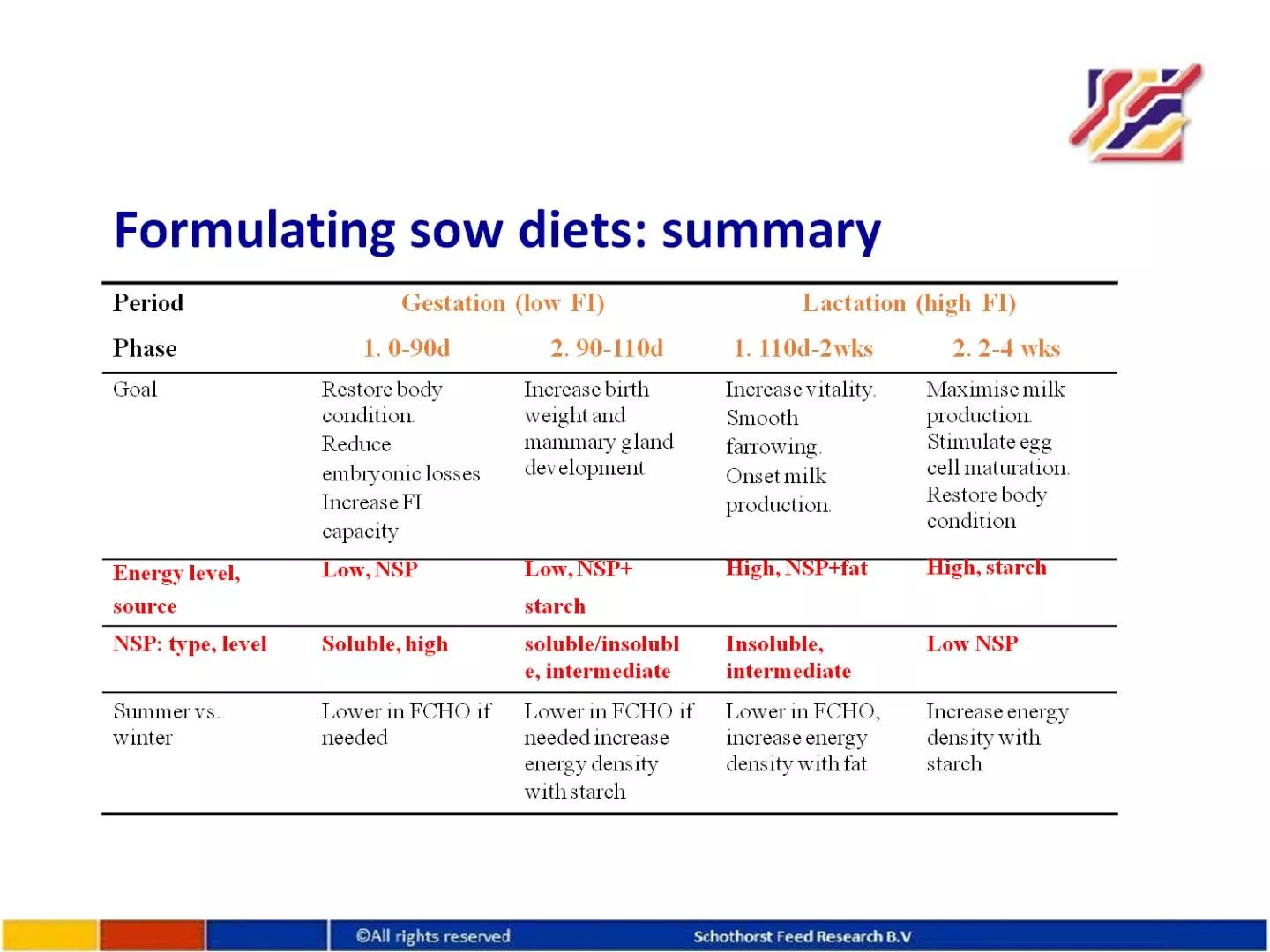 对于泌乳期母猪饲料,饲料中蛋白含量高将降低饲料采食量,尤其在热应激状态下,因此考虑以可消化氨基酸为基础的理想蛋白质模型来做配方,使用合成氨基酸和高质量蛋白饲料原料;淀粉和糖是生糖营养素,可以提高产奶量并降低体重损失,因此只有当母猪处于能量负平衡状态下再额外添加脂肪。发酵纤维和木质素可降低母猪便秘。