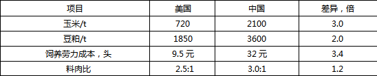 在一头商品育肥猪的饲养成本中,饲料成本约占70%,工人饲养费约占25%,其余5%主要来自设备折旧、土地租金及水电等。在饲料成本中,由于PSY差异较大导致仔猪出生饲料成本差异较大,按照断奶仔猪摊分母猪用饲料量计算,美国平均每出生1头仔猪用料约45 kg,而在中国每出生1头仔猪用料约75 kg;按育肥猪出栏体重125kg计算,中国平均料肉比是美国的1.2倍;再者,美国的主要饲料原料价格相对较低,其玉米价格约为中国1/3,豆粕价格约为中国的一半左右。劳动力成本中,中国每头育肥猪的饲养成本约为32元,是美国的3.4倍。可见,在生猪养殖成本中,中国的饲料和饲养成本大约是美国的3倍左右。