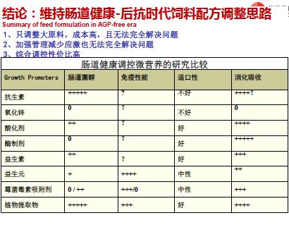 1)通过重新优化饲料配方降低粗蛋白水平,加大氨基酸用量和可发酵纤维的水平,增加脂肪中U/S的比率,使用添加剂产品(有机酸、植物提取物等),抗生素的使用量可以降低,但的确与用抗生素相比,生产性能有一定程度的下降。